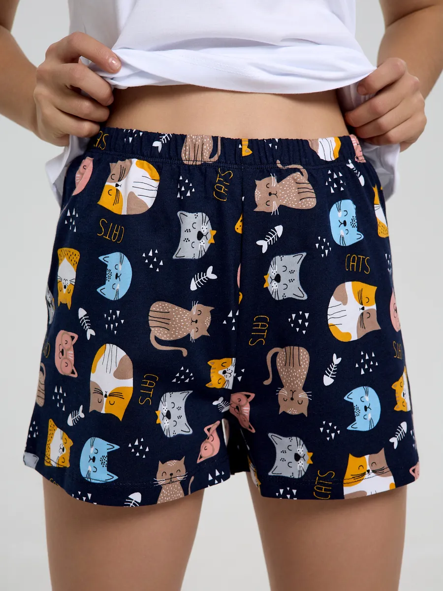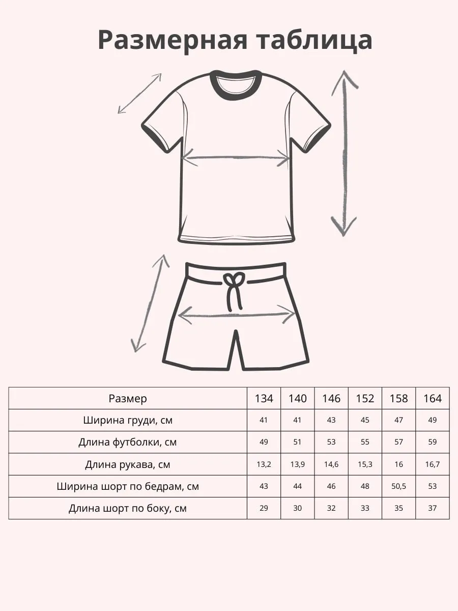 В комплект входят свободные шорты с эластичным поясом и футболка комфортного кроя. Оверсайз посадка не сковывает движения, не давит на живот и подходит для активных игр, отдыха и расслабления. Практичный дизайн позволяет носить элементы комплекта как вместе, так и отдельно.