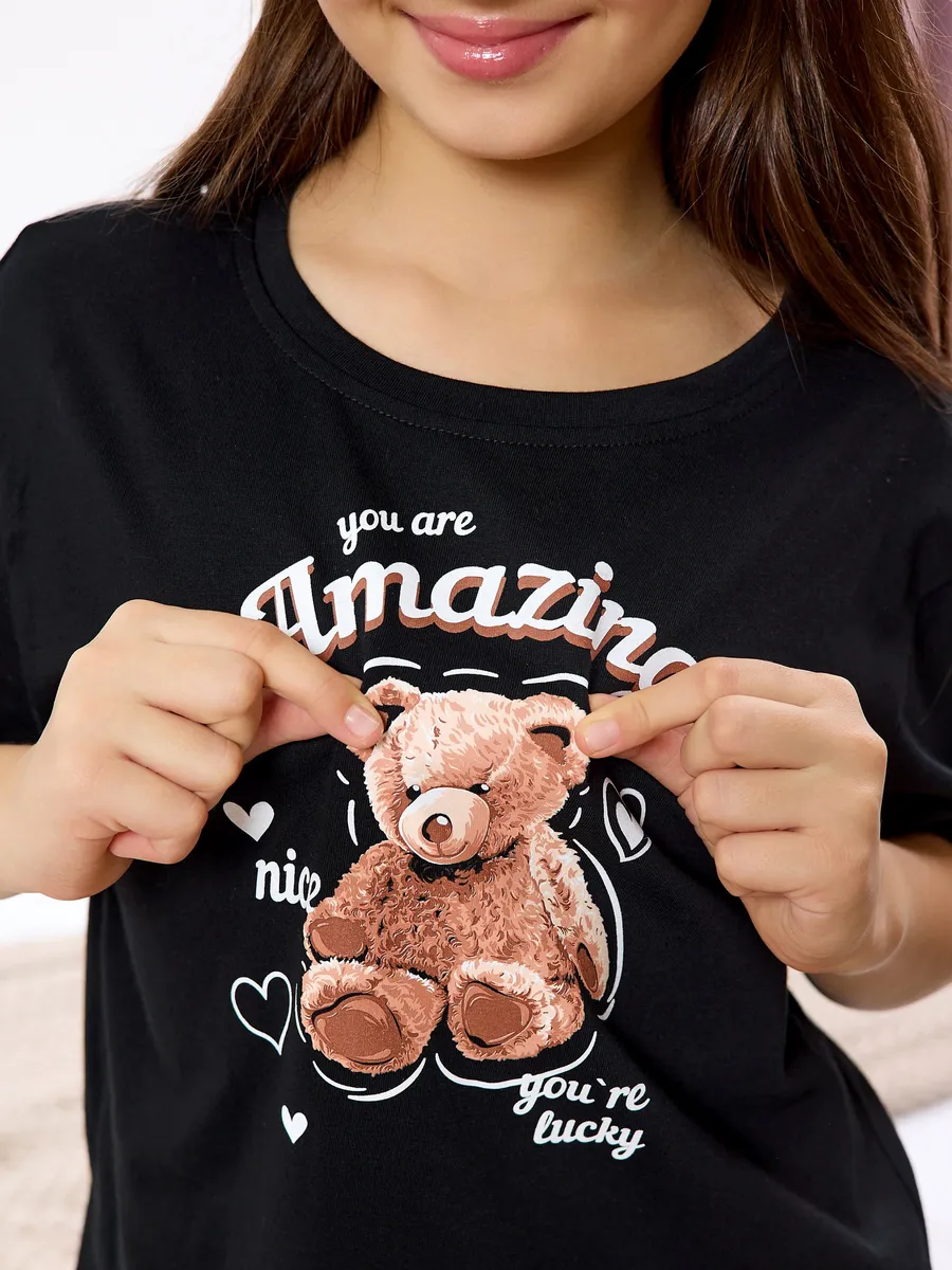Представляем вам пижаму оверсайз для девочки, изготовленную из легкого и дышащего материала. Наши пижамы изготовлены из хлопка премиального качества, приятный к телу и дышащий материал обеспечит вашему ребенку свободу движений и комфорт. Комплект пижамы состоит из оверсайз футболки и свободных шорт. Удобные шорты имеют пояс на резинке, которые не вытягиваются после продолжительного использования, и не сдавливают живот. Универсальный вариант для сна, ночевок с подругами и идеальный подарок на День Рождение или 8-е марта.