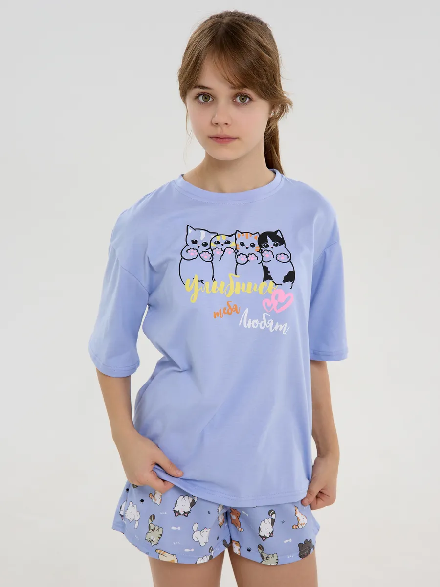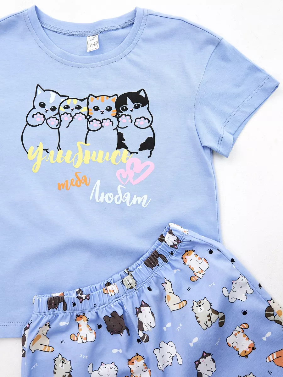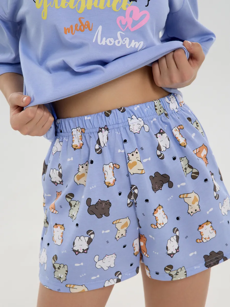 Пижама предназначена не только для сна, но и для активных игр дома. Комфортный крой одежды позволит ребенку свободно двигаться без чувства скованности. Практичный дизайн понравится как детям, так и родителям: пижама согреет зимой, а текстура ткани обеспечит нежное и легкое прикосновение к коже летом. Изделие выполнено из высококачественного хлопка, который не вызывает раздражения на коже, не протирается и не теряет свою яркость. Домашний комплект отличается не только функциональностью, но и стильным внешним видом: яркий цвет и модный принт с котятами подойдут каждой девочке! Оптимальная длина шорт предотвращает их короткость, а аккуратный пошив с ровными строчками и отсутствием торчащих ниток гарантирует качество изделия. Пижама для девочки с шортами идеально подходит для повседневной носки дома. Пижама для девочки представлена в различных размерах от 134 до 170. Благодаря расширенной размерной сетке, данная модель подходит как маленьким девочкам, так и молодым девушкам-подросткам.