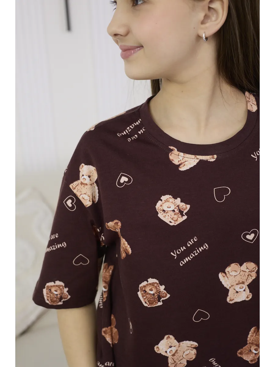 Представляем вам пижаму оверсайз для девочки, изготовленную из легкого и дышащего материала. Наши пижамы изготовлены из хлопка премиального качества, приятный к телу и дышащий материал обеспечит вашему ребенку свободу движений и комфорт. Комплект пижамы состоит из оверсайз футболки и свободных шорт. Удобные шорты имеют пояс на резинке, которые не вытягиваются после продолжительного использования, и не сдавливают живот. Универсальный вариант для сна, ночевок с подругами и идеальный подарок на День Рождение или 8-е марта.