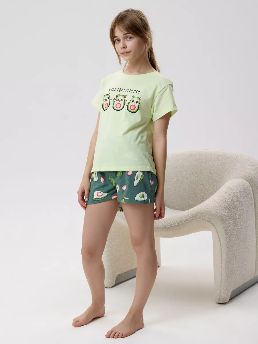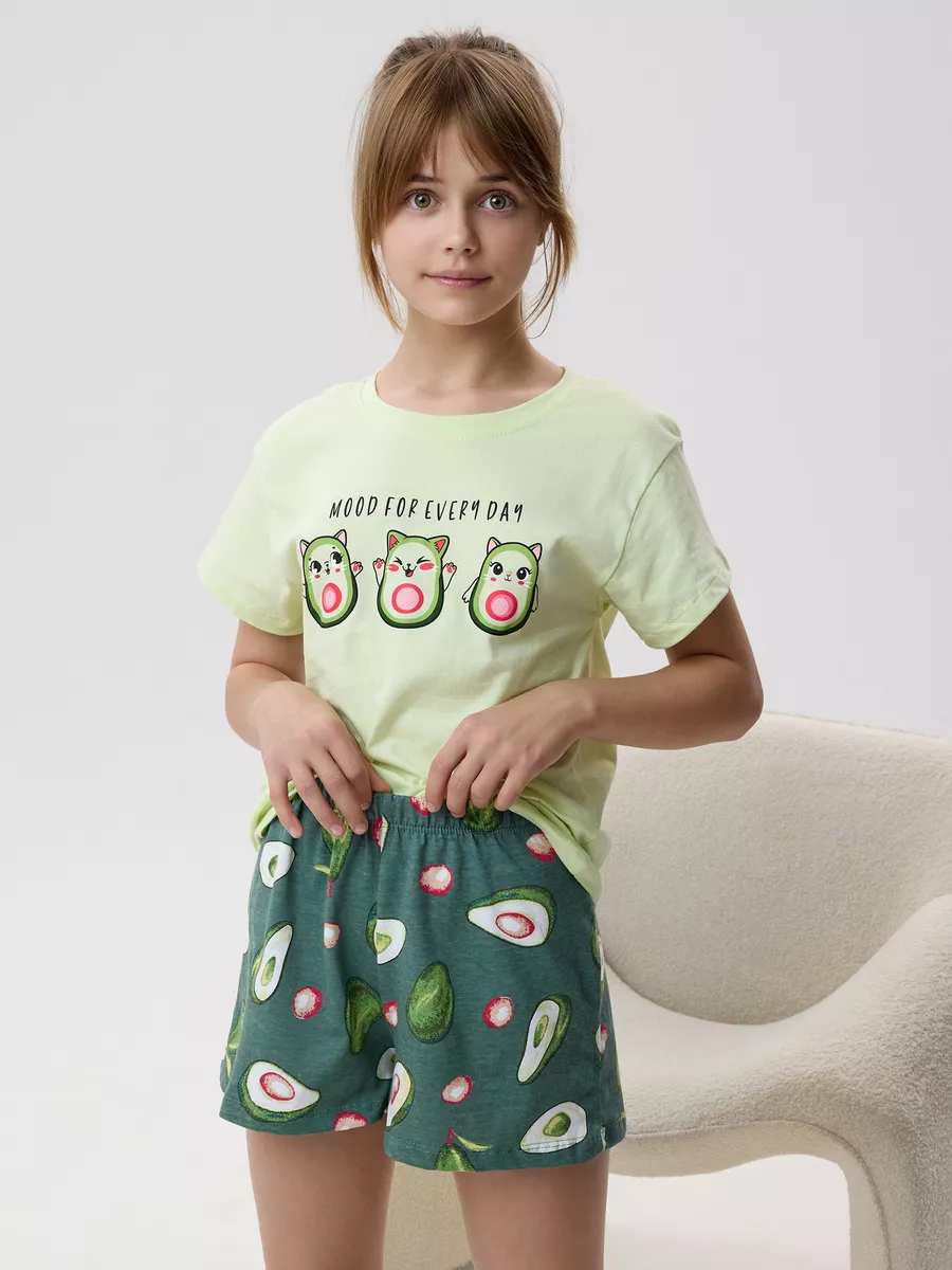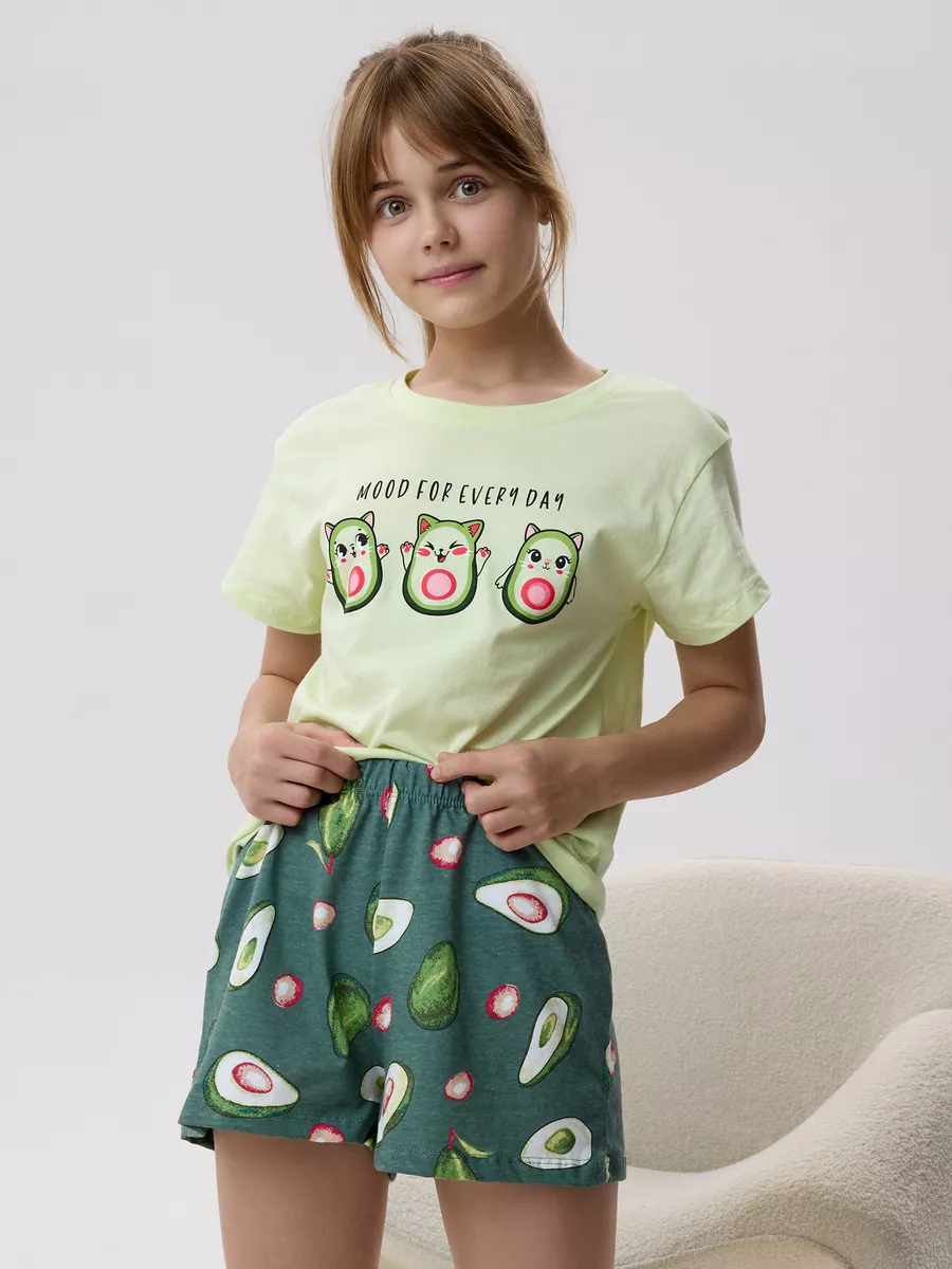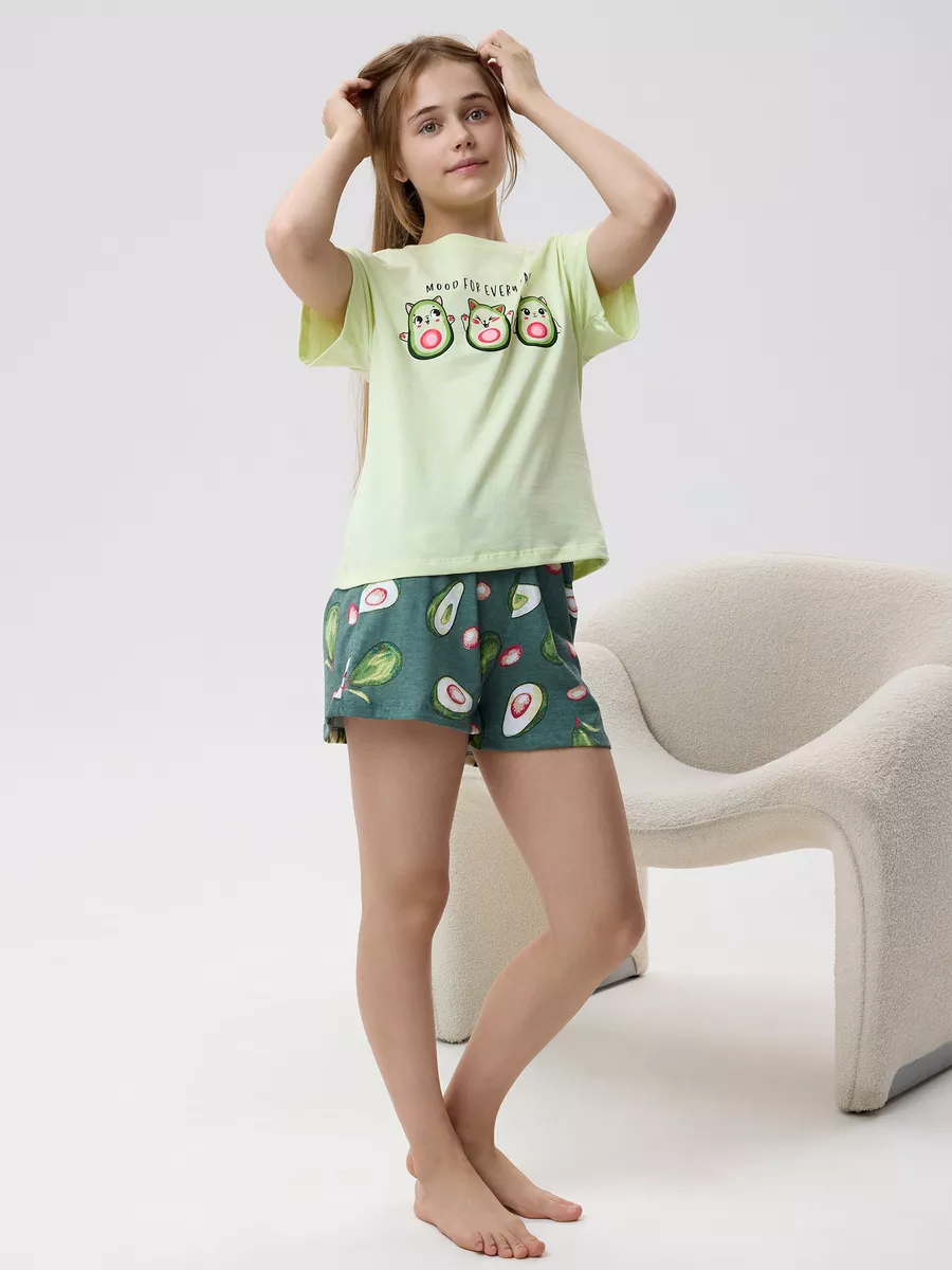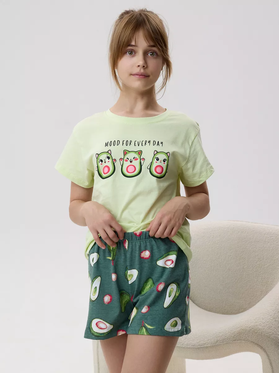 Пижама предназначена не только для сна, но и для активных игр дома. Комфортный крой одежды позволит ребенку свободно двигаться без чувства скованности. Практичный дизайн понравится как детям, так и родителям: пижама согреет зимой, а текстура ткани обеспечит нежное и легкое прикосновение к коже летом. Изделие выполнено из высококачественного хлопка, который не вызывает раздражения на коже, не протирается и не теряет свою яркость. Домашний комплект отличается не только функциональностью, но и стильным внешним видом: яркий цвет и модный принт с авокадо-кошками подойдут каждой девочке! Оптимальная длина шорт предотвращает их короткость, а аккуратный пошив с ровными строчками и отсутствием торчащих ниток гарантирует качество изделия. Пижама для девочки с шортами идеально подходит для повседневной носки дома. Пижама для девочки представлена в различных размерах от 134 до 164. Благодаря расширенной размерной сетке, данная модель подходит как маленьким девочкам, так и молодым девушкам-подросткам.