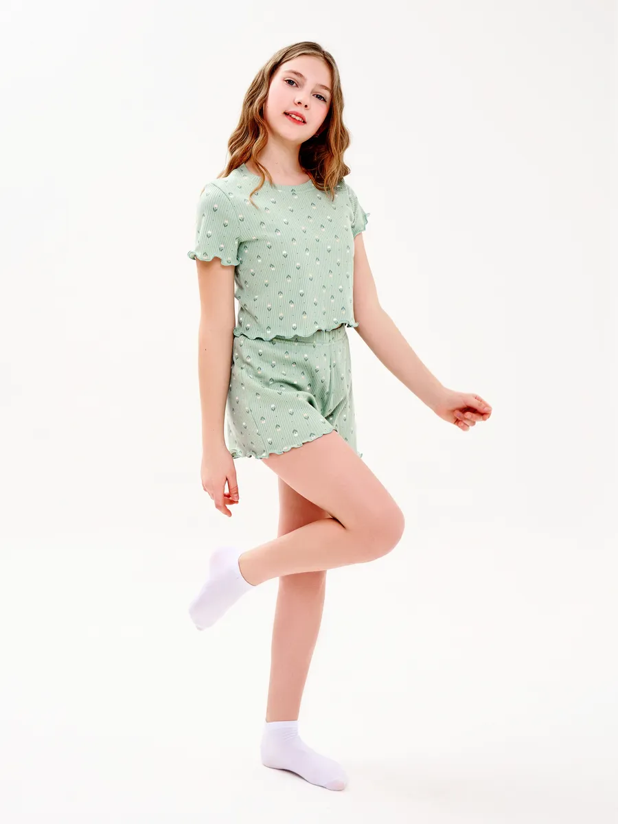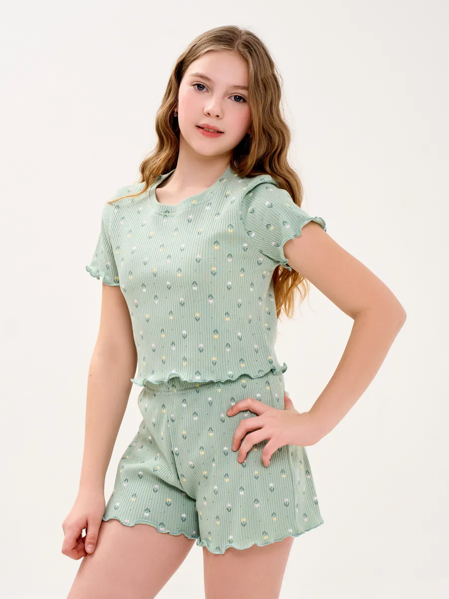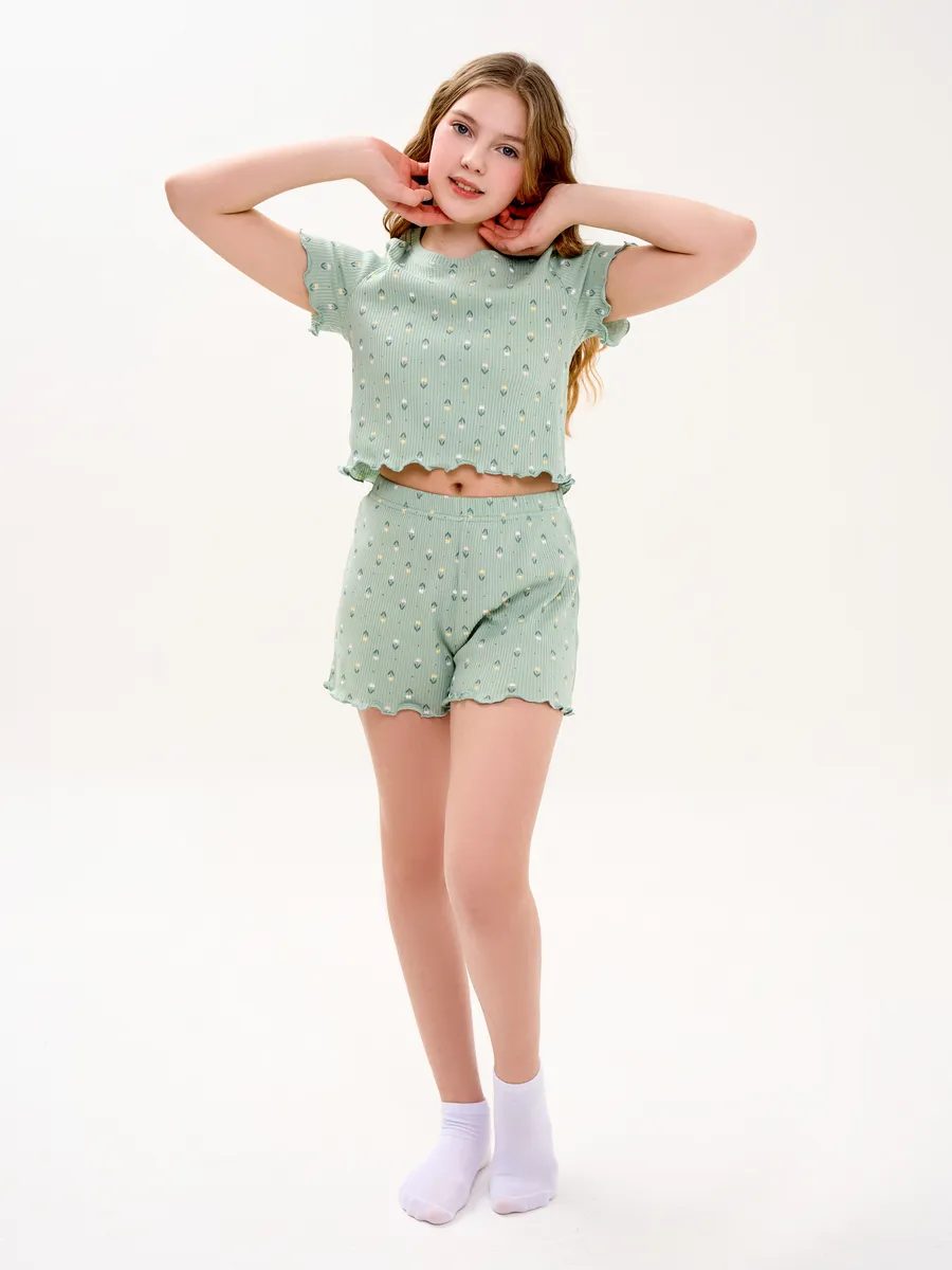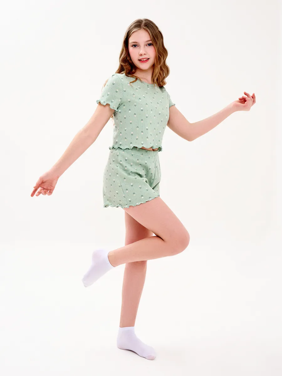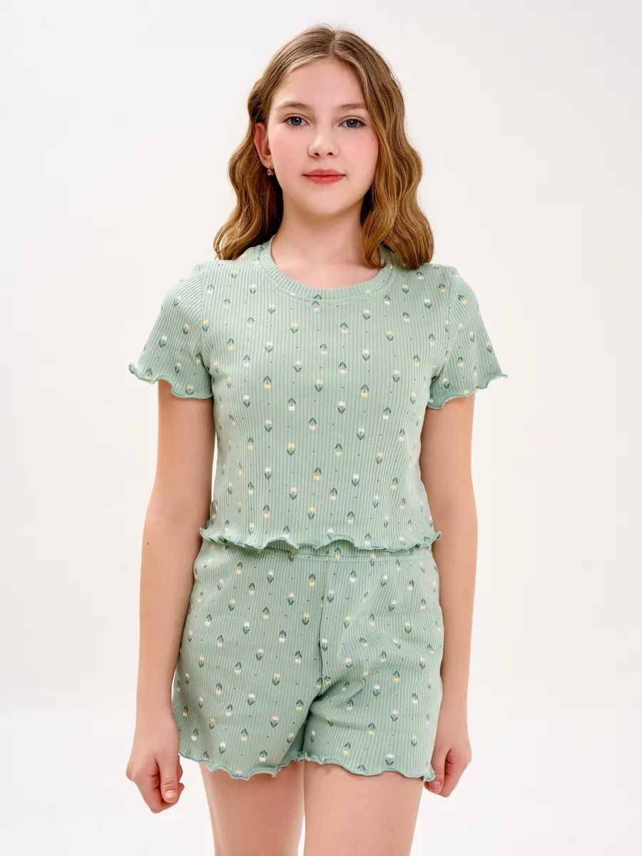 Пижама предназначена не только для сна, но и для активных игр дома. Комфортный крой одежды позволит ребенку свободно двигаться без чувства скованности. Практичный дизайн понравится как детям, так и родителям: пижама согреет зимой, а текстура ткани обеспечит нежное и легкое прикосновение к коже летом. Изделие выполнено из высококачественного хлопка, который не вызывает раздражения на коже, не протирается и не теряет свою яркость. Домашний комплект отличается не только функциональностью, но и стильным внешним видом: нежный, приятный хаки/оливковый цвет и модный принт с цветочками подойдут каждой девочке! Оптимальная длина шорт предотвращает их короткость, а аккуратный пошив с ровными строчками и отсутствием торчащих ниток гарантирует качество изделия. Пижама для девочки из лапши с шортами идеально подходит для повседневной носки дома. Пижама для девочки представлена в различных размерах от 134 до 164. Благодаря расширенной размерной сетке, данная модель подходит как маленьким девочкам, так и молодым девушкам-подросткам.